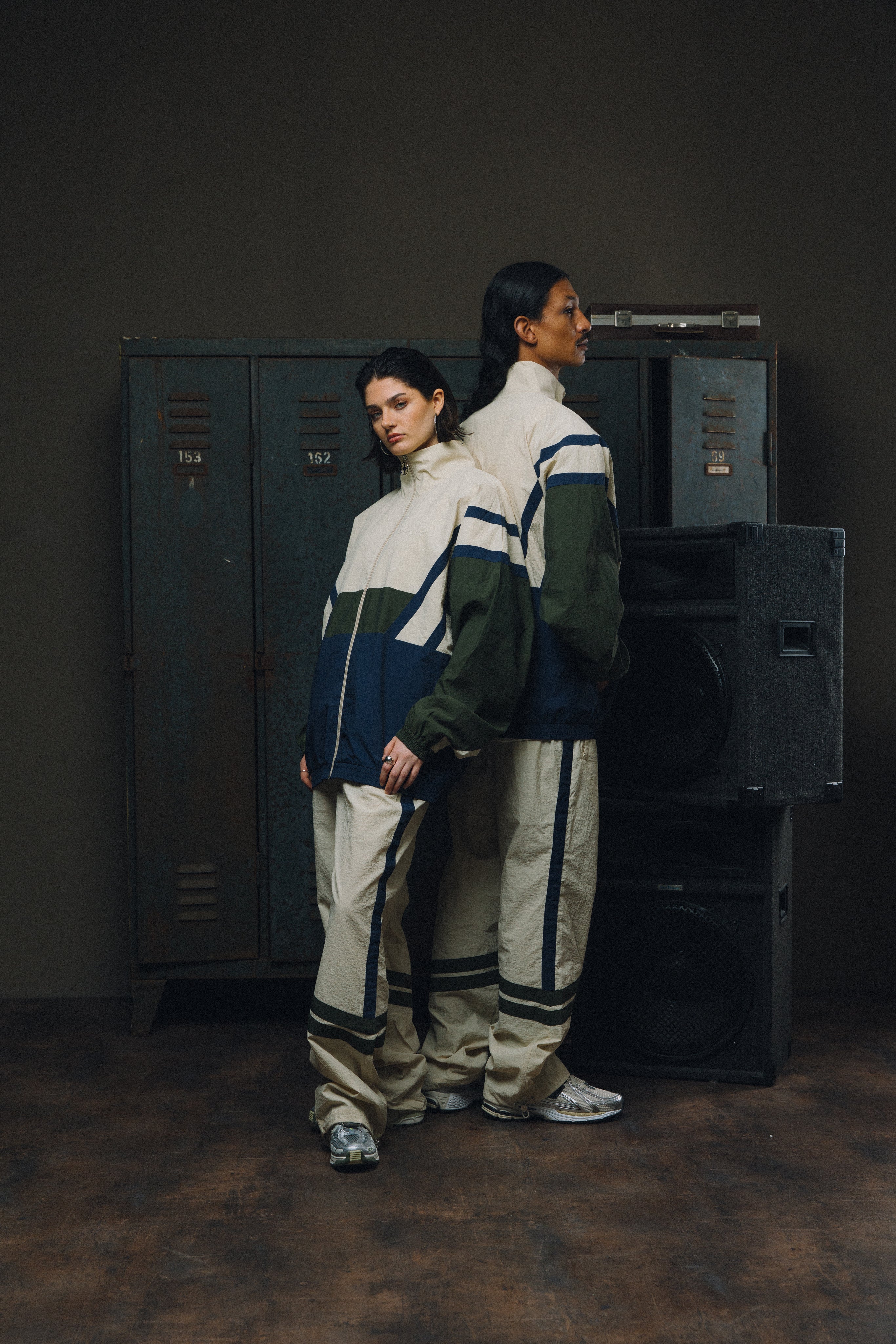 Iconic silhouettes take center stage, with baggy tracksuit bottoms, slightly loose jeans, and classic T-shirts anchoring the lineup.